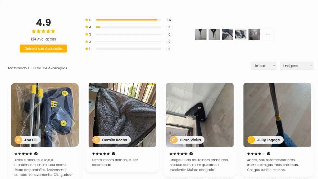 Não fique torcendo o pano molhado com as mãos, você só puxa o cabo do esfregão e ele espreme toda a água sozinho, sem fazer esforço.